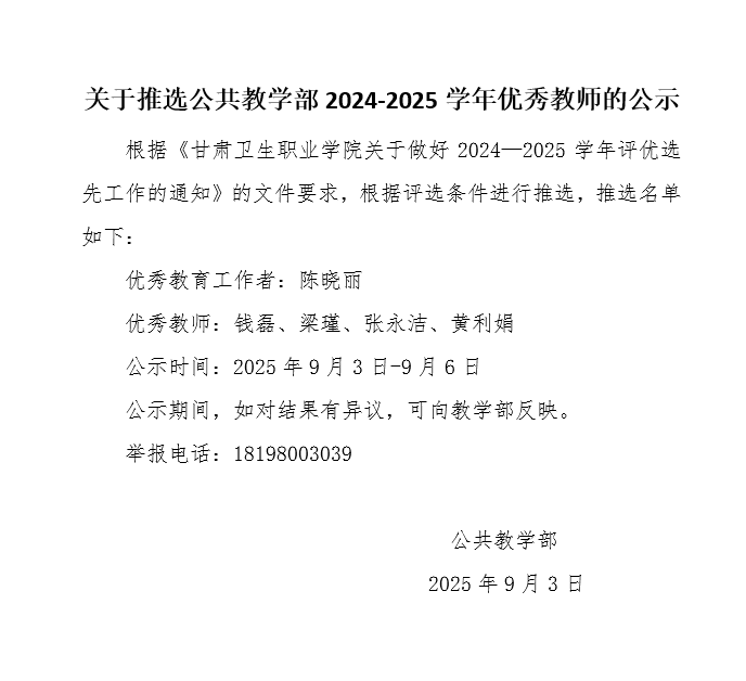 关于推选公共教学部2024-2025学年优秀教师的公示