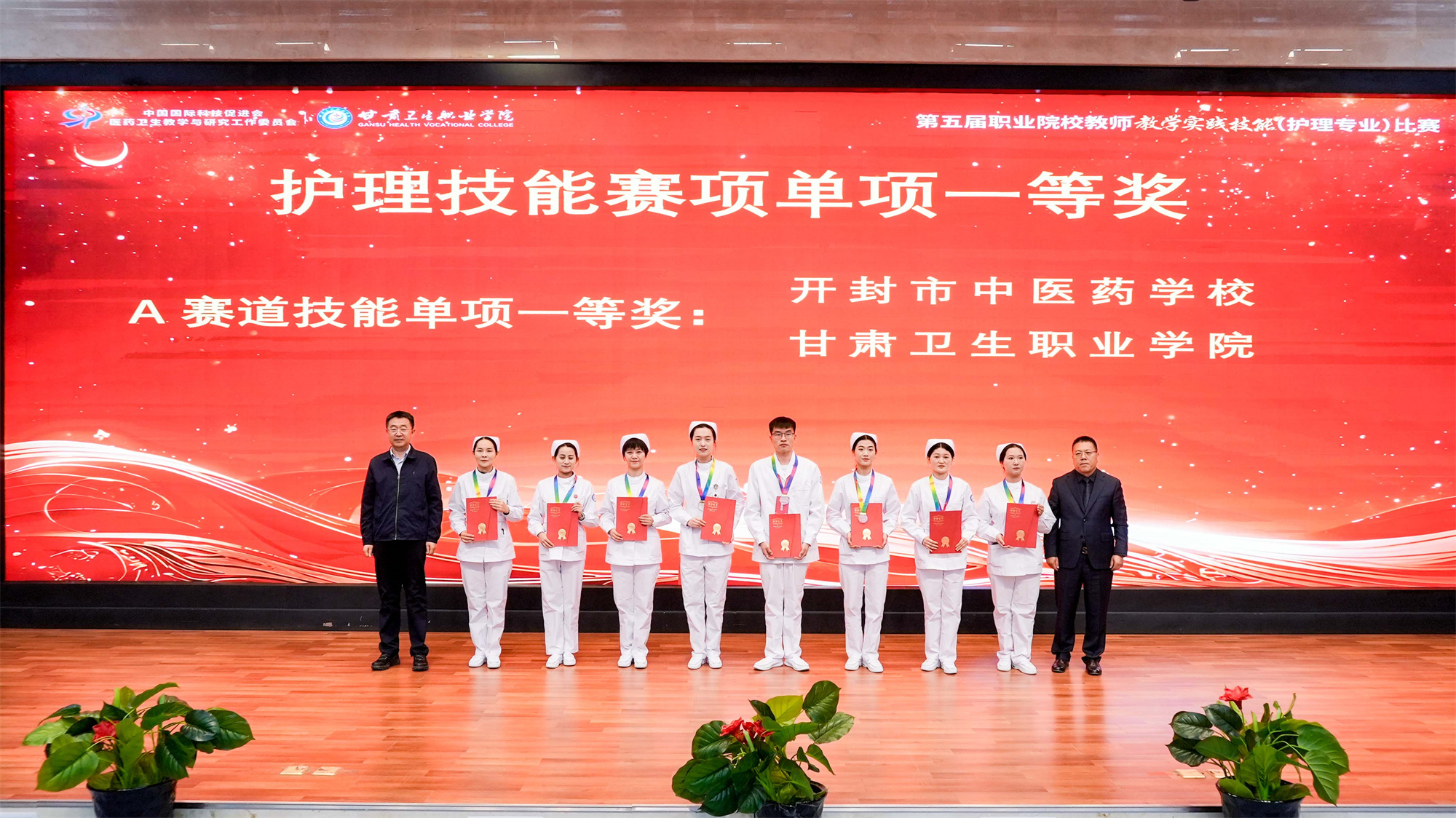 闭赛式上,高璀乡、刘华平、王文海先后宣读了说课程赛项单项奖、护理技能赛项单项奖、团体奖、优秀指导教师奖名单。与会领导、来宾为获奖选手、团队颁发获奖证书、奖牌和奖杯。我校选手、团队表现优异,斩获多项荣誉。孙南竹老师荣获说课程赛项A赛道一等奖,韩媛媛老师荣获说课程赛项A赛道二等奖,学校荣获护理技能赛项A赛道一等奖、高职组团体一等奖,温萌老师、达朝锦老师荣获优秀指导教师奖。