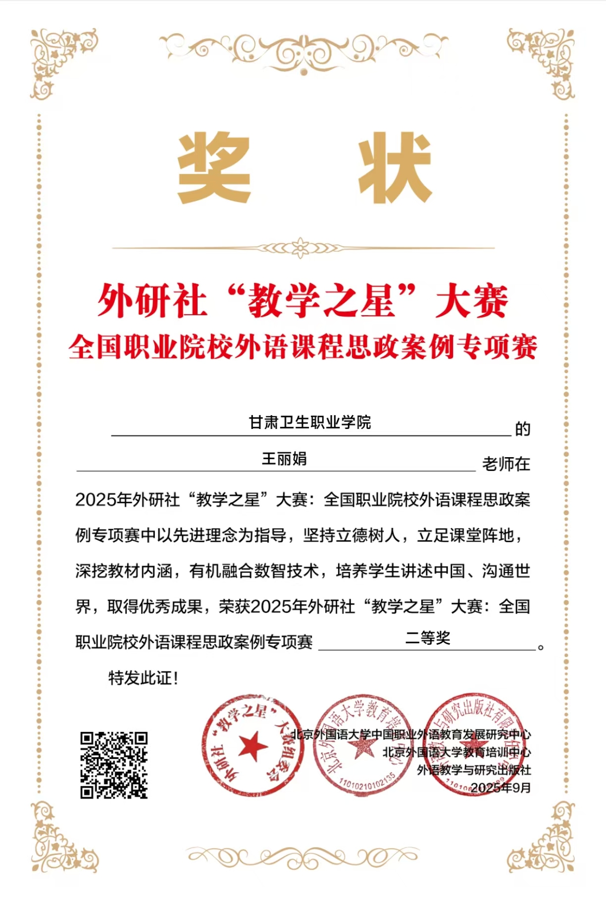 为全面推进职业院校外语课程思政高质量建设,促进职业院校教师落实立德树人根本任务,外语教学与研究出版社于今年启动2025年外研社“教学之星”大赛“全国职业院校外语课程思政案例专项赛”。本次大赛以“外语教材的有效使用:讲述中国,沟通世界”为主题,公共教学部教师钱磊的获奖案例以外语课程中“Hobbies”主题单元为切入点,通过“认知与表达-理解与交流-文化与拓展”系统化的跨文化教学设计,突出了“文化浸润+职业赋能”双路径思政融入模式,实现了语言学习与思政育人的有机统一,获得特等奖;王丽娟老师获得该赛项二等奖。同期范瑶老师团队获得2025年外研社“教学之星”大赛(高职组)全国复赛二等奖,成功展现了外语课程在立德树人方面的创新探索与扎实成效,为同类课程思政建设提供了可复制,可推广的范式。