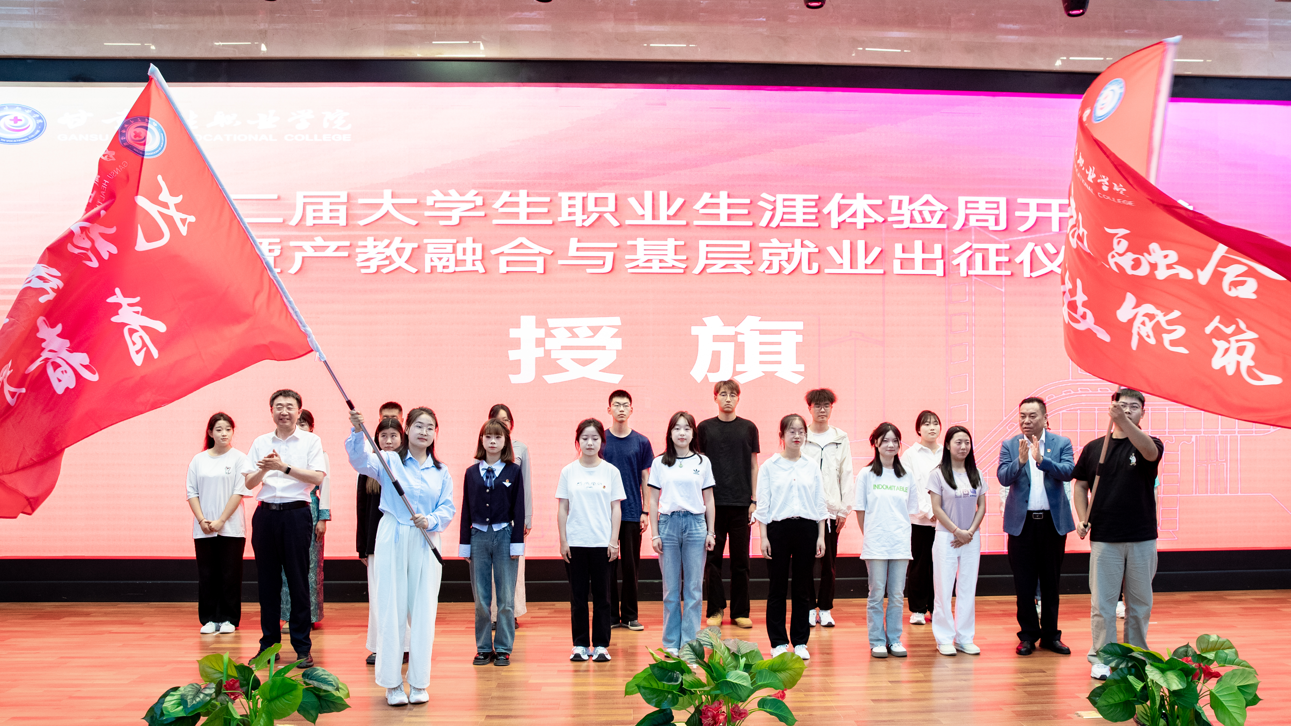 在激扬的旋律中,党委书记包磊、校长王建成向19名产教融合及基层就业学生代表授旗,赠送了纪念品。