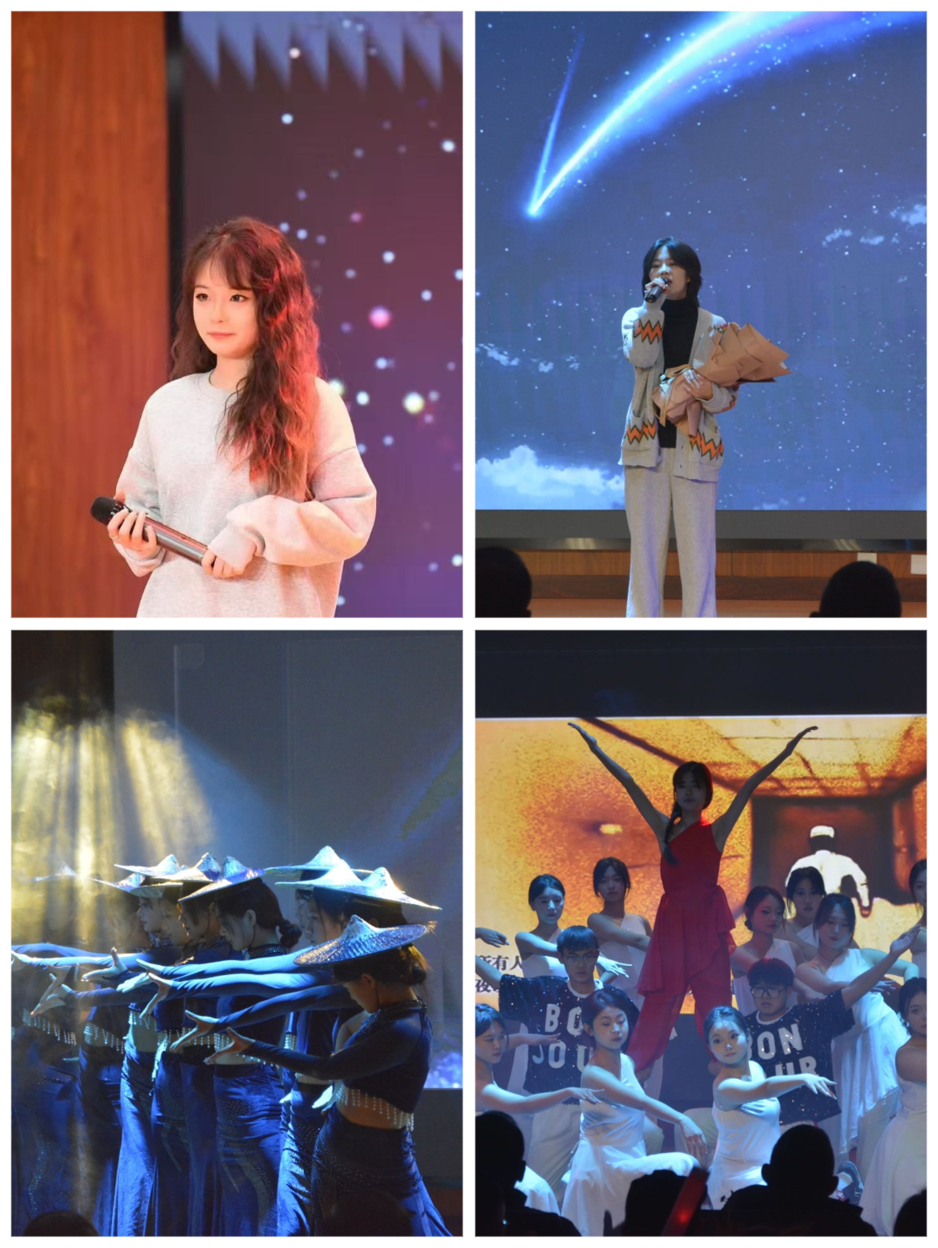 晚会在铿锵的锣鼓声中拉开了序幕,历经了8场筛选的唱歌和舞蹈类节目依次出演,共同奏响节日欢歌。每一首歌曲,激情动听、荡人心弦;每一支舞蹈,刚柔并济,翩若惊鸿。活动最后,学院舞蹈队带来的傣族舞《陶醉了》压轴上场,展现了傣族文化的美丽和神秘,带给观众强烈的视觉享受。