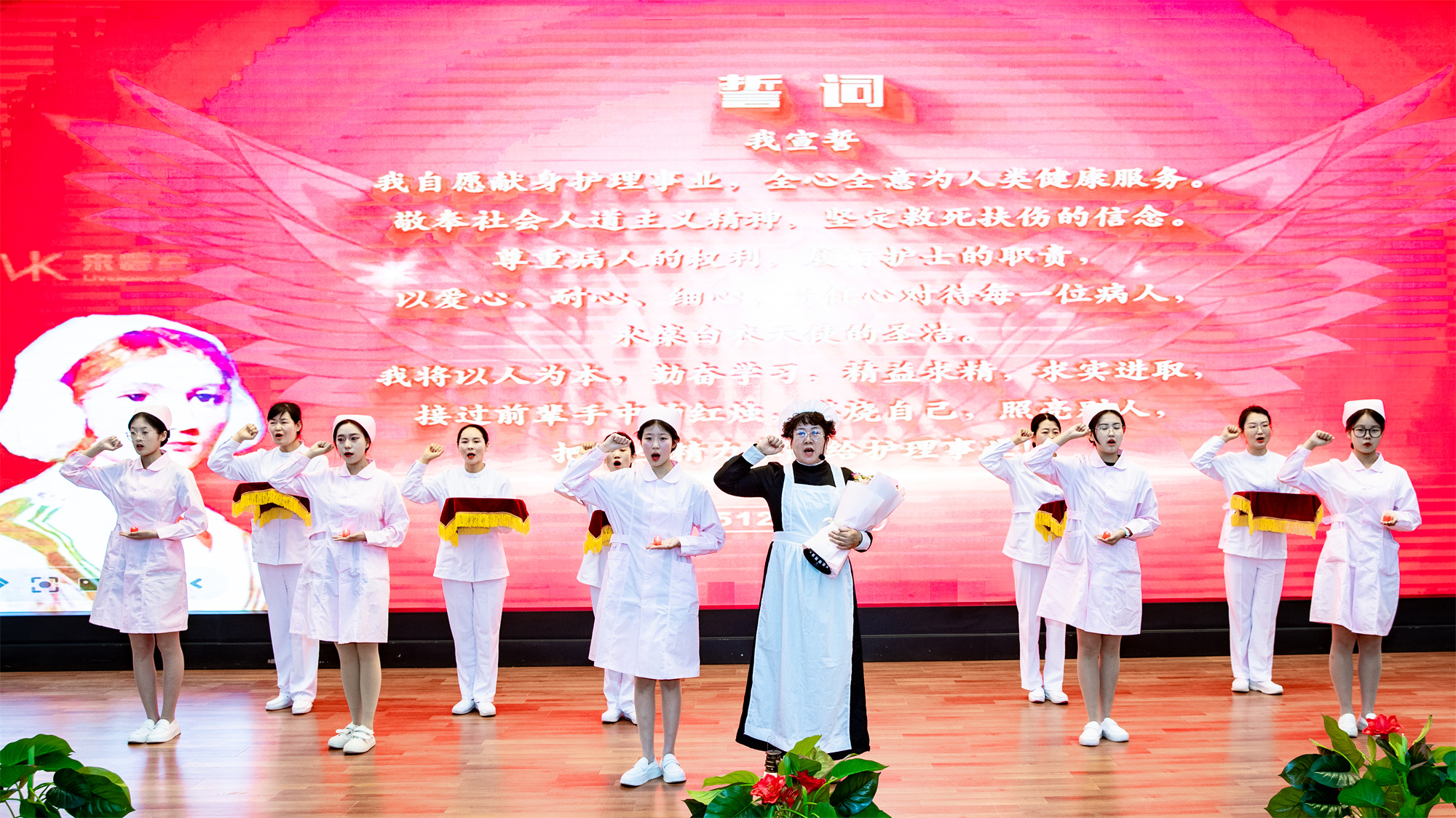 活动第三阶段举行了授帽仪式,象征着责任与传承的燕帽在灯光下熠熠生辉,与会领导、护理专家、老师们为护理专业的同学们戴上燕帽,传递着南丁格尔精神的光芒。庄严的宣誓声中,新一代护理人铭记初心,坚定信念,誓以仁心仁术守护生命,续写护理事业的辉煌篇章。
