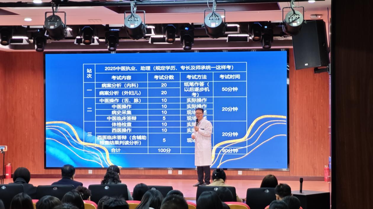 为助力我校中医类专业学生精准把握执业准入标准,系统提升备考效能,3月24日晚中医学院特邀助理医师资格考试命题研究专家恒远教授,在岐黄楼报告厅开展“中医助理医师资格考试全流程解析”专题讲座。活动采取线上线下相结合模式,2025届返校定向生、2021级备考学生及相关任课教师现场参会,2022级至2024级在校学生通过钉钉直播同步观看。