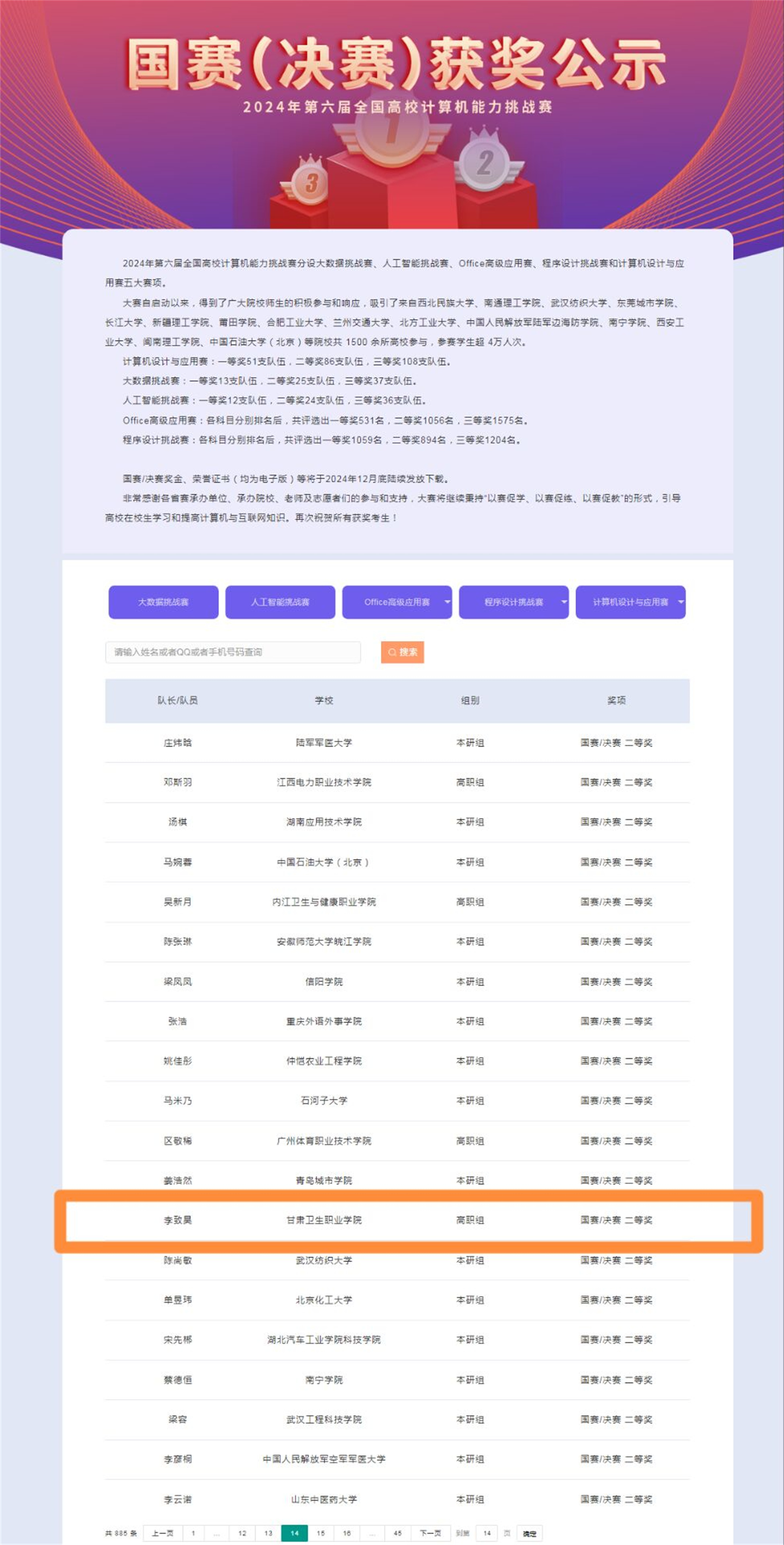 本次总决赛为前期各省赛、区域赛的一等奖选手们的再次比拼,共有来自北京化工大学、中国石油大学(北京)、中国人民解放军空军军医大学、合肥工业大学等900余所高校的学生参加。我校选手在备赛过程中,通过系统的培训和刻苦的练习,不断提升自己的计算机操作技能和团队协作能力。在比赛中,他们沉着冷静、灵活应变,充分展现了扎实的专业技能和良好的心理素质。这些荣誉不仅是对选手们个人努力的肯定,也充分展示了我校计算机应用课程的教学成果。