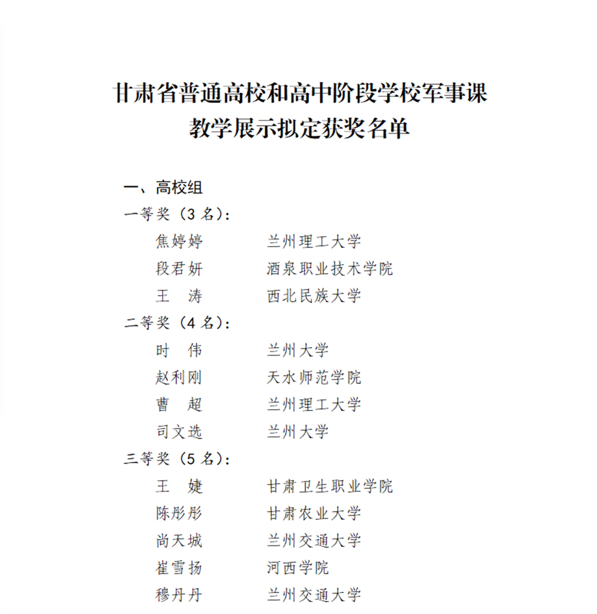 近期,由省教育厅主办、兰州理工大学承办的首届甘肃省普通高校和高中阶段学校军事课教学展示活动在兰州理工大学举办。我校护理学院王婕老师在决赛中表现优异,与一众本科院校的军事理论课教师同台竞技,在高校组名列八强,荣获三等奖。