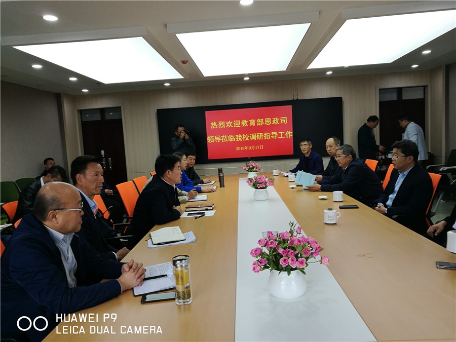 2018年9月17日下午,根据教育部关于对高校思政工作开展调研工作的安排,教育部思想政治工作司副司长张文斌率教育部调研组一行4人在省教育厅副厅长赵凯、省高校工委思政处处长温攀玺和兰州新区职教园区管委会领导的陪同下,对我院思政工作开展情况进行了实地调研。学院党委书记姜德民、副校长任世伟及党办、宣传部、学工部等相关部门负责人参加了调研活动。