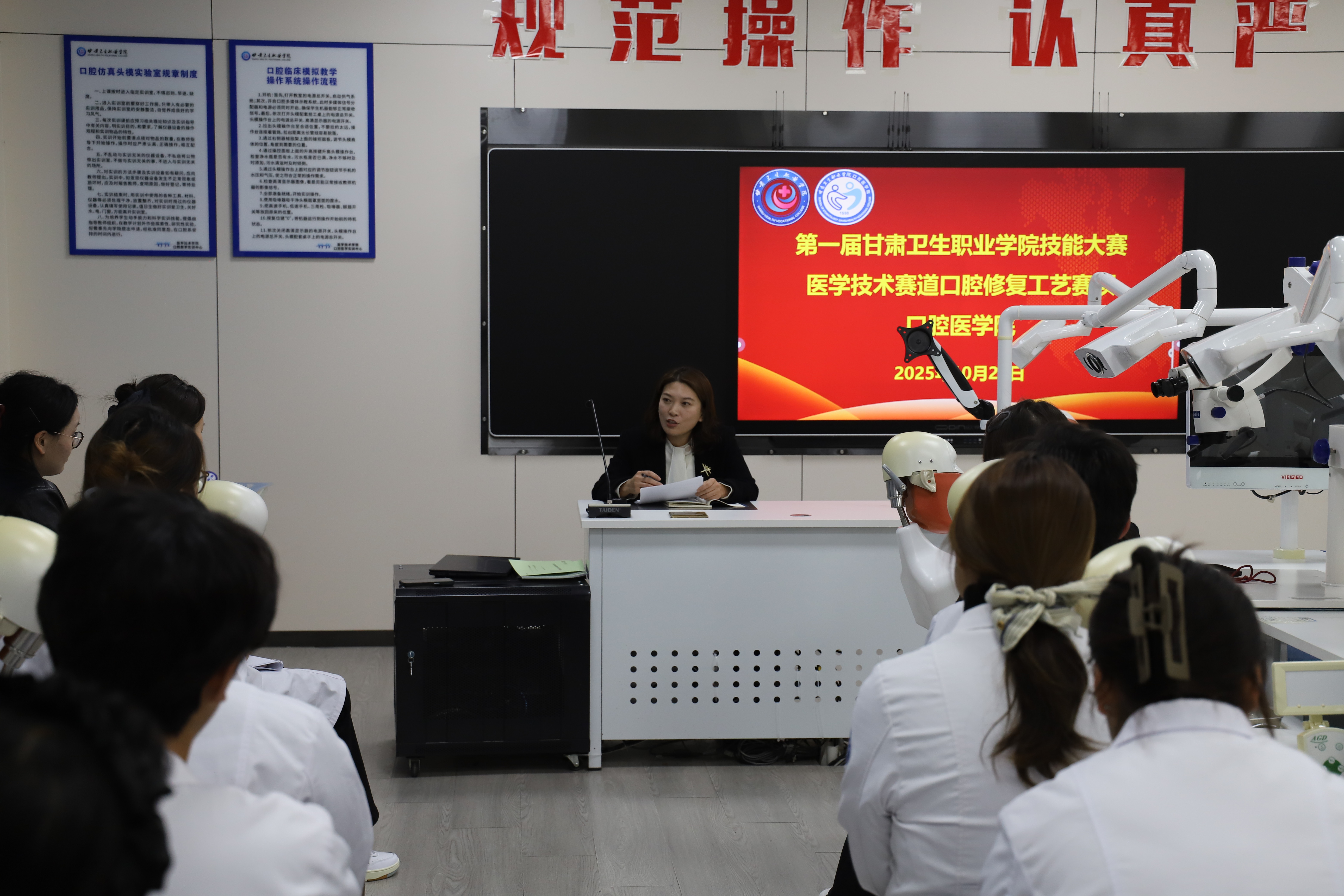 为确保赛事评审的专业性与权威性,比赛特邀请资深专家组成评审团。包括2025年世界职业院校技能大赛医学技术赛道金奖团队指导教师库莉博、河西学院口腔医学系主任魏轩、甘肃省人民医院口腔修复科主任杨倩、甘肃鑫大正医疗器械有限公司总经理高彩霞以及甘肃东兴义齿有限公司总经理寇斌。专家团队覆盖教学、临床、义齿加工企业等多个领域,为赛事评审提供了全方位、高标准的专业支撑。