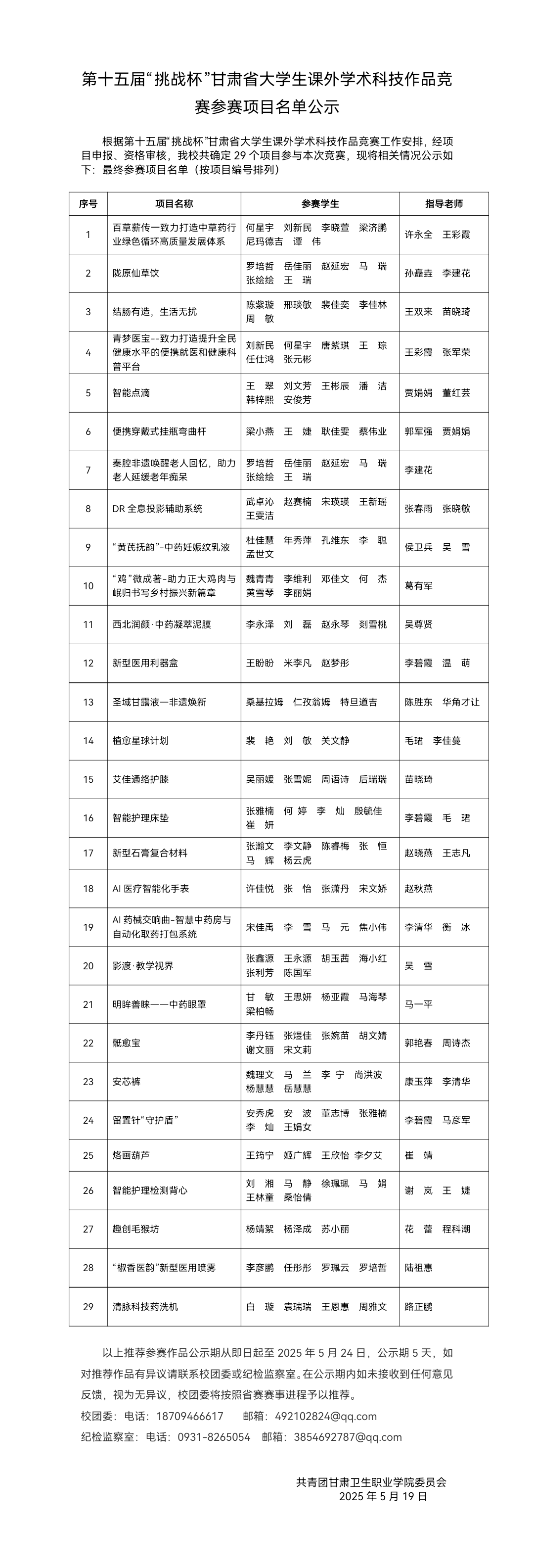 第十五届“挑战杯”甘肃省大学生课外学术科技作品竞赛参赛项目名单公示