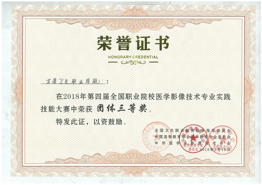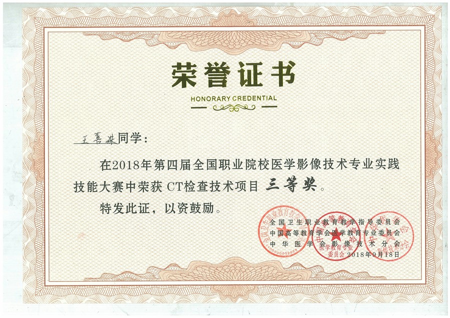 2018年9月16日—18日,第四届“新华杯”全国职业院校医学影像技术专业实践技能大赛在山东新华医疗器械股份有限公司举行。本次大赛由全国卫生职业教育教学指导委员会与全国高等教育学会医学分会主办,中华医学会影像技术分会协办。来自全国50所高职高专院校的200名选手参赛。经过激烈角逐,我校代表队荣获团体三等奖,参赛选手白璐荣获超声项目二等奖,徐琳荣获DR项目二等奖,王喜珠荣获CT项目三等奖。