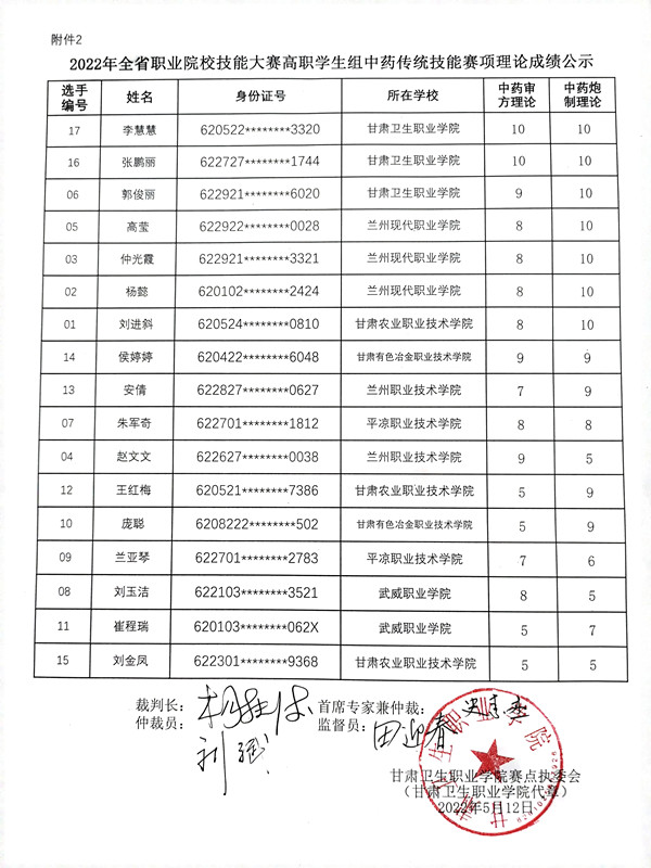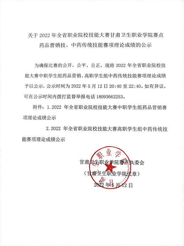 关于2022年全省职业院校技能大赛英国365上市官网赛点药品营销技能、中药传统技能赛项理论成绩的公示