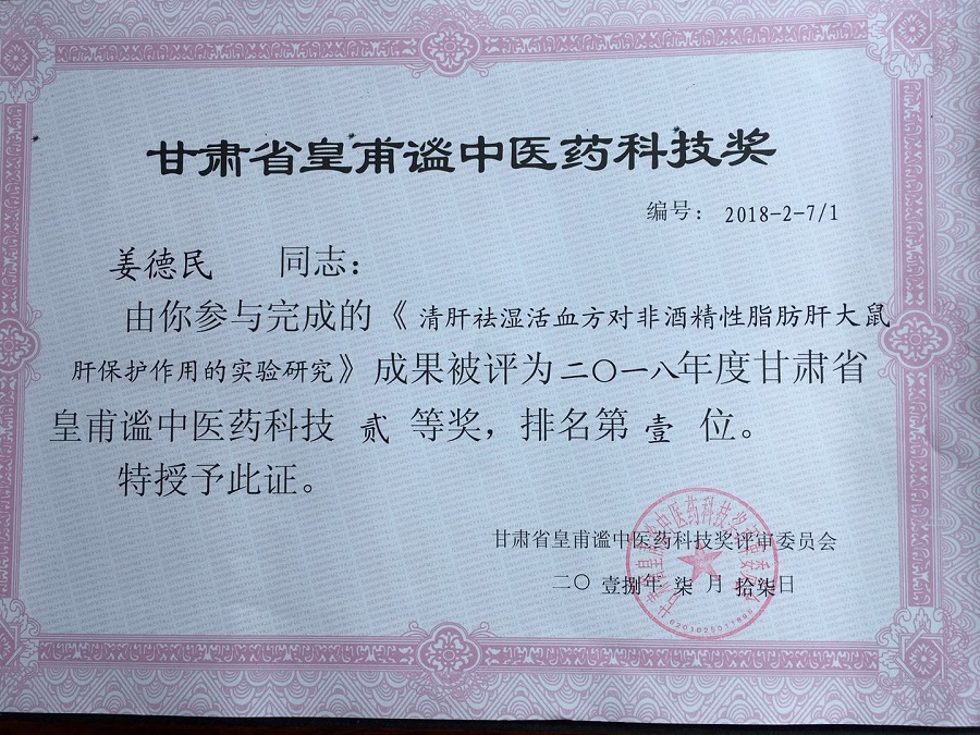 我院姜德民书记主持科研成果喜获2018年度甘肃省皇甫谧中医药科技二等奖发布时间:2018-09-25