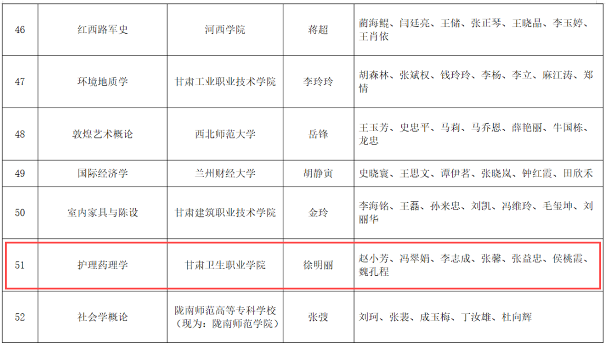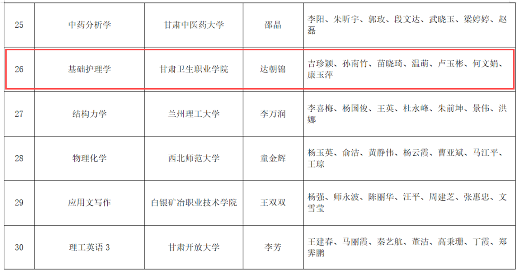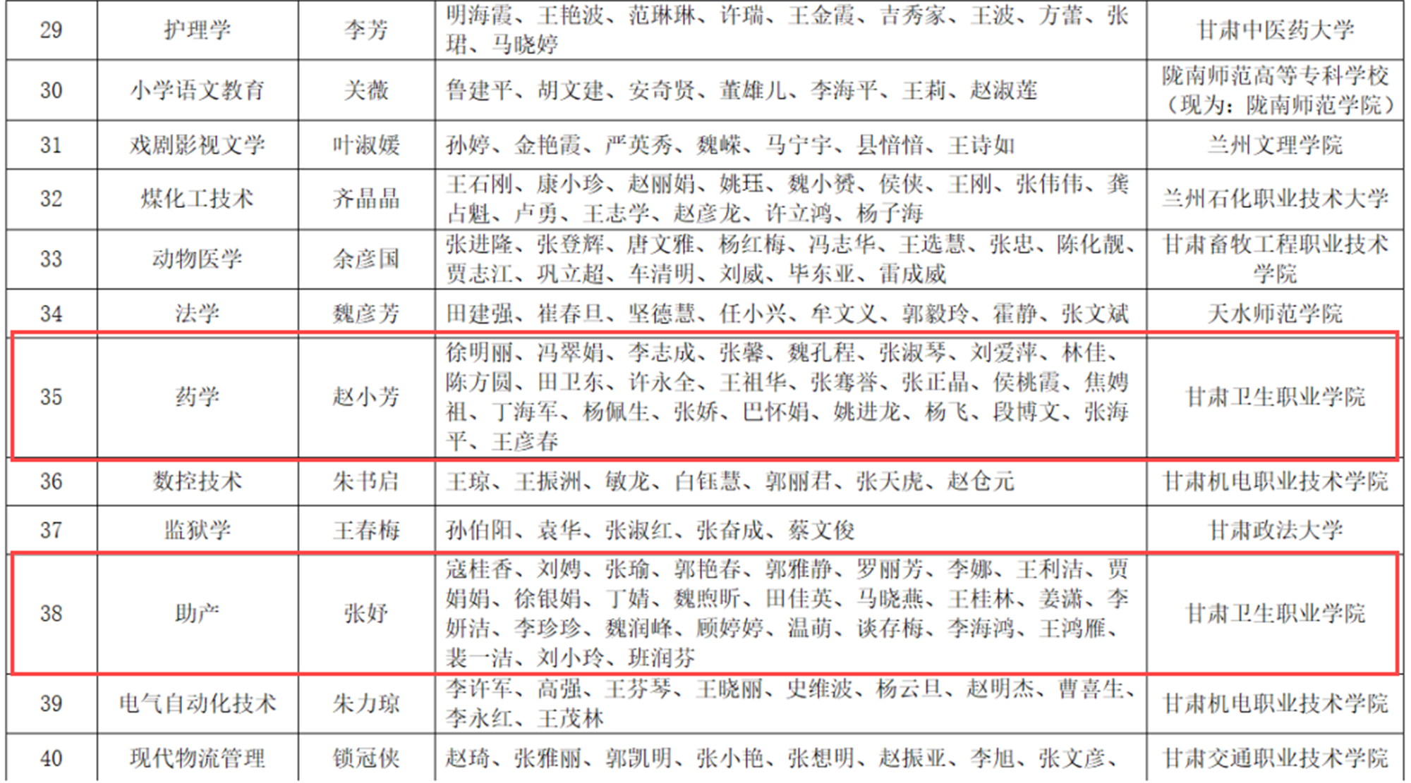 近日,甘肃省教育厅印发《关于公布第二批甘肃省高校课程思政示范项目名单的通知》(甘教高函〔2024〕16 号),我校推荐申报的药学和助产2个专业均获批甘肃省课程思政示范专业,由达朝锦老师领衔的《基础护理学》和徐明丽老师领衔的《护理药理学》2门课程及其教学团队分别获批甘肃省课程思政示范课程、教学名师和团队。