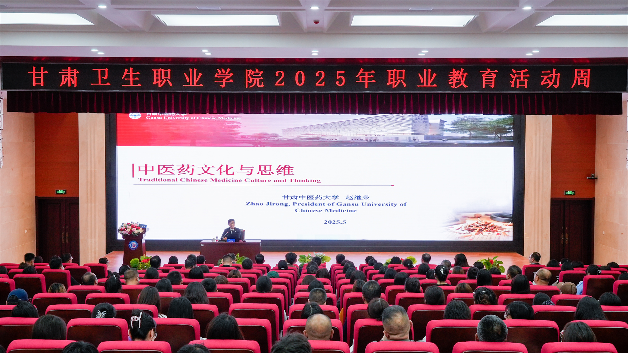 5月15日,学校科技讲坛“院士进校园 博导入课堂”系列学术活动第二十九场讲座在笃学楼多功能报告厅圆满举行。本次讲座特邀甘肃中医药大学校长、博士生导师赵继荣教授,为我校师生作题为《中医药文化与思维》的学术讲座。赵继荣教授是享受国务院政府特殊津贴专家、甘肃省名中医、中医骨伤科专家,此次讲座也是学校职业教育活动周技能人才进校园活动之一。学校在家校领导、专兼职教师及学生代表等300余人现场参会。