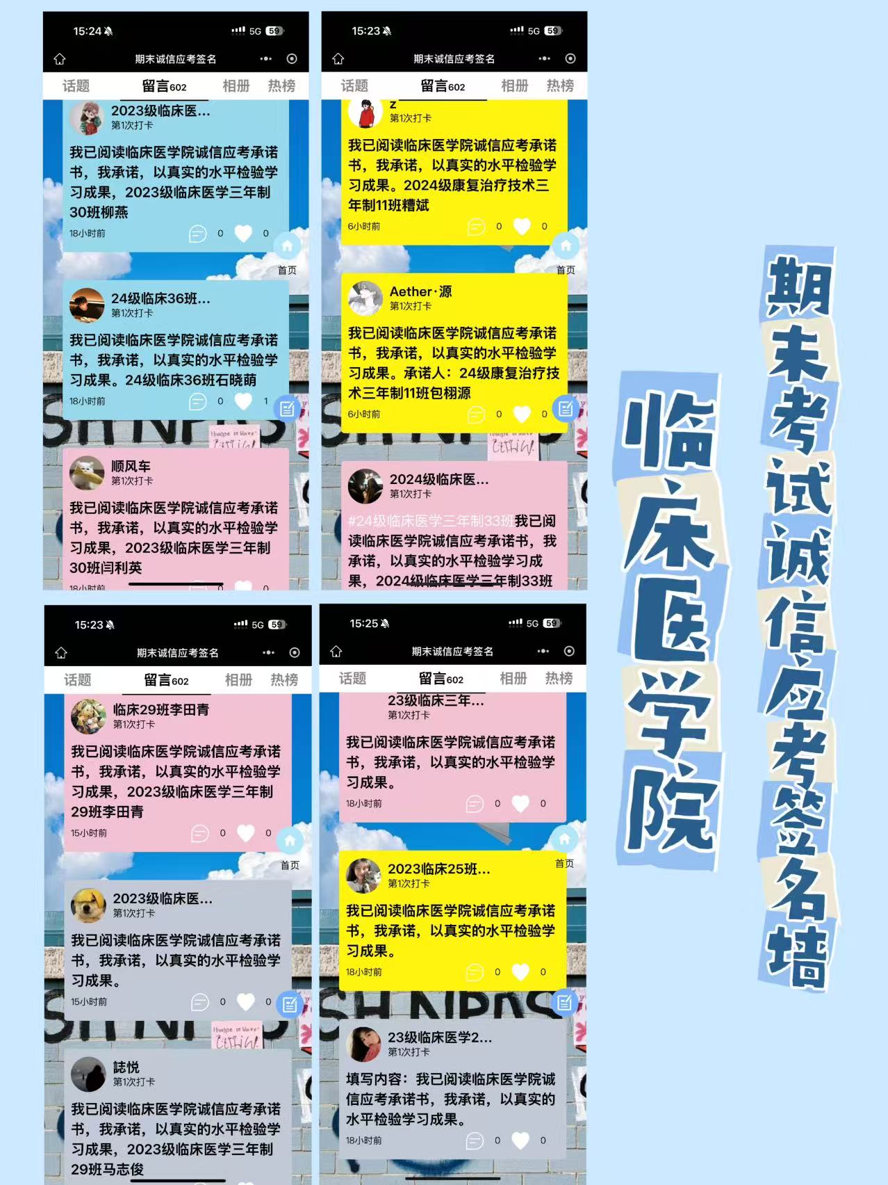 在互动环节,同学们围绕“如何做到诚信应考”展开热烈讨论,踊跃发言。有人提出要提前做好复习规划,避免因知识漏洞产生侥幸心理;有人建议互相监督,共同营造诚信考试氛围。此外,学院还举办了以线上留言墙签署《诚信考试承诺书》的活动,同学们郑重地签下自己的姓名,承诺以诚实的态度、踏实的复习来检验自己这学期的学习收获。