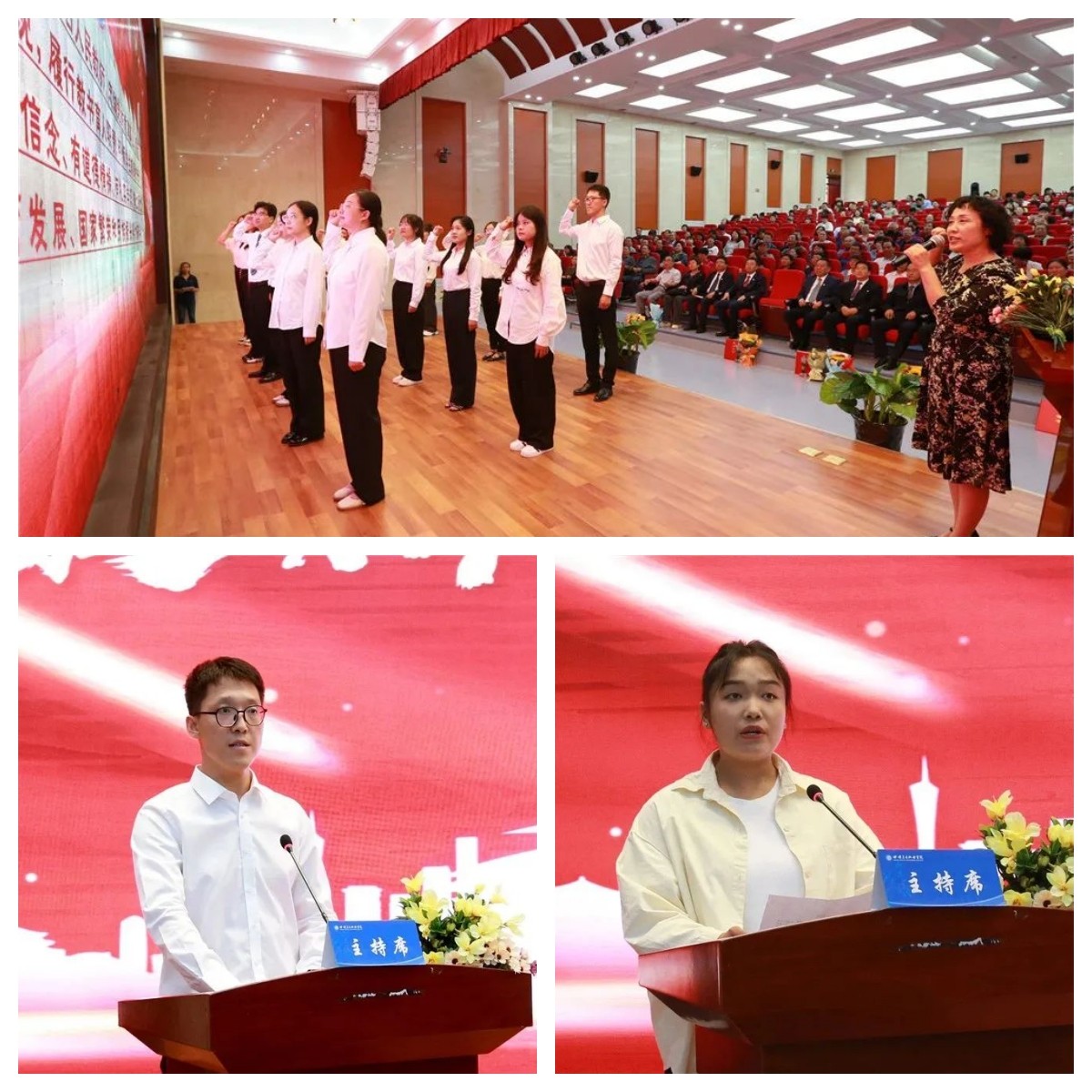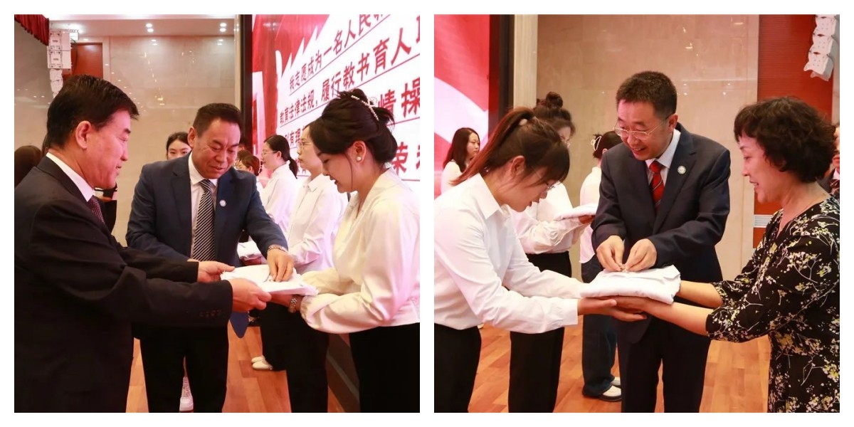 大会上举行了新教师入职宣誓仪式。由任晖领誓,17名新入职教师共同庄严宣读人民教师誓词,姜德民、任晖、包磊、王建成新老两届校领导为新教师授校徽和工作服,完成了站上讲台前的第一课。