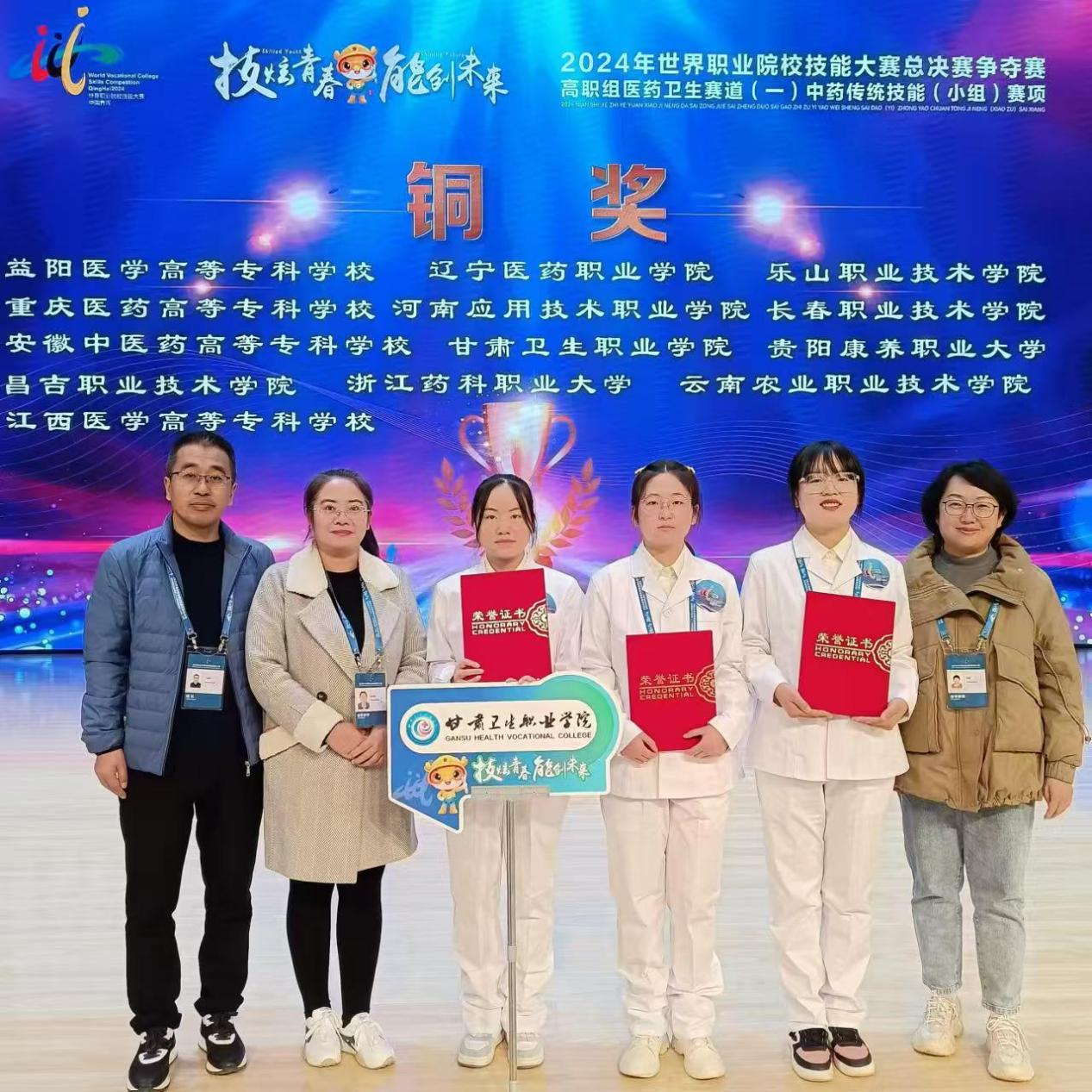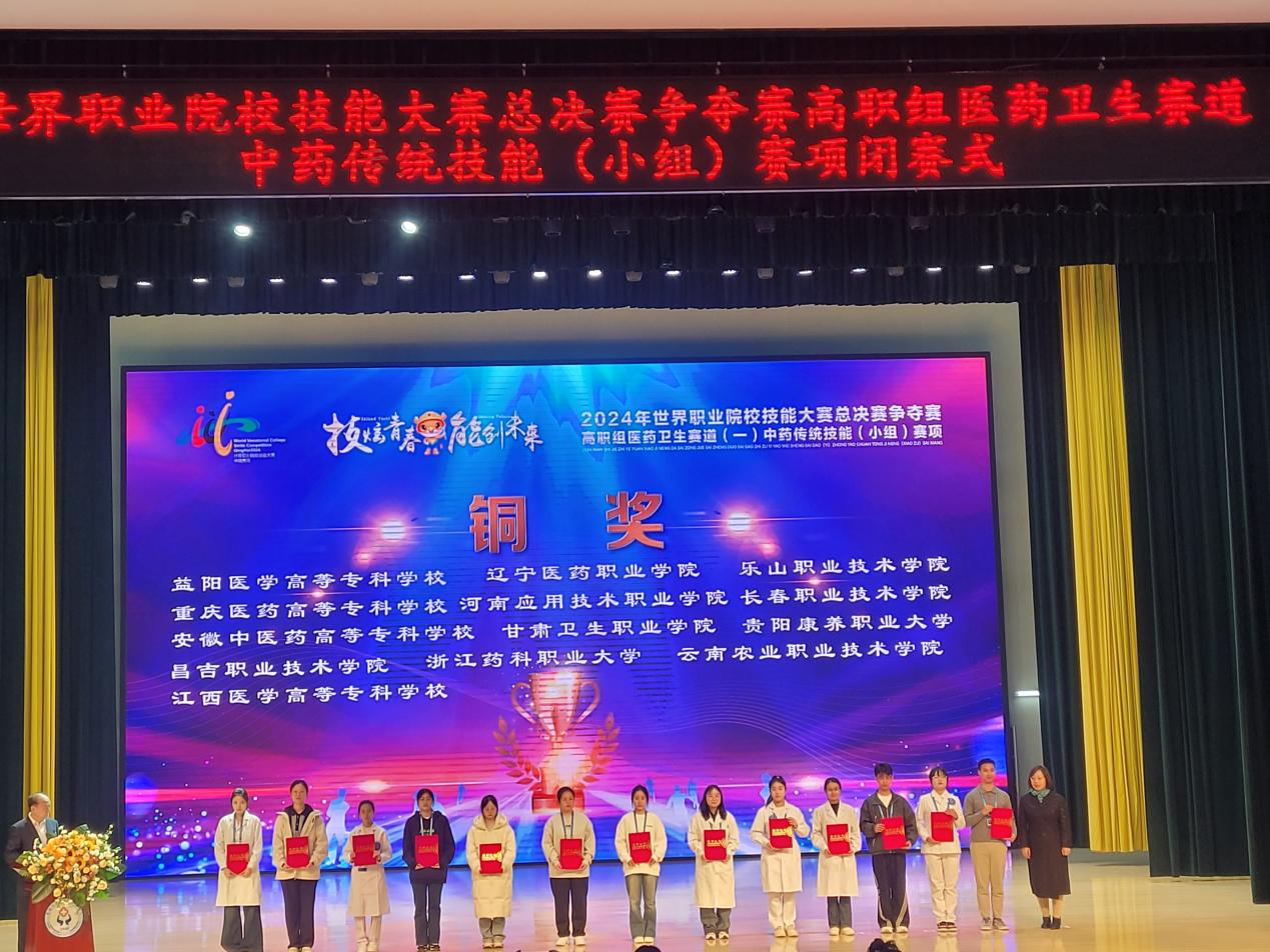 10月28日至11月1日,2024年世界职业院校技能大赛总决赛医药卫生赛道一(中药传统技能赛项)争夺赛在青海卫生职业技术学院成功举办。来自全国各地的55支优秀参赛队,共190名参赛选手同台竞技。我校药学院选派由陈方圆、宋爽老师指导的丁芳、贾敏、肖晓童团队参赛,以平行组第3名的成绩荣获铜奖。