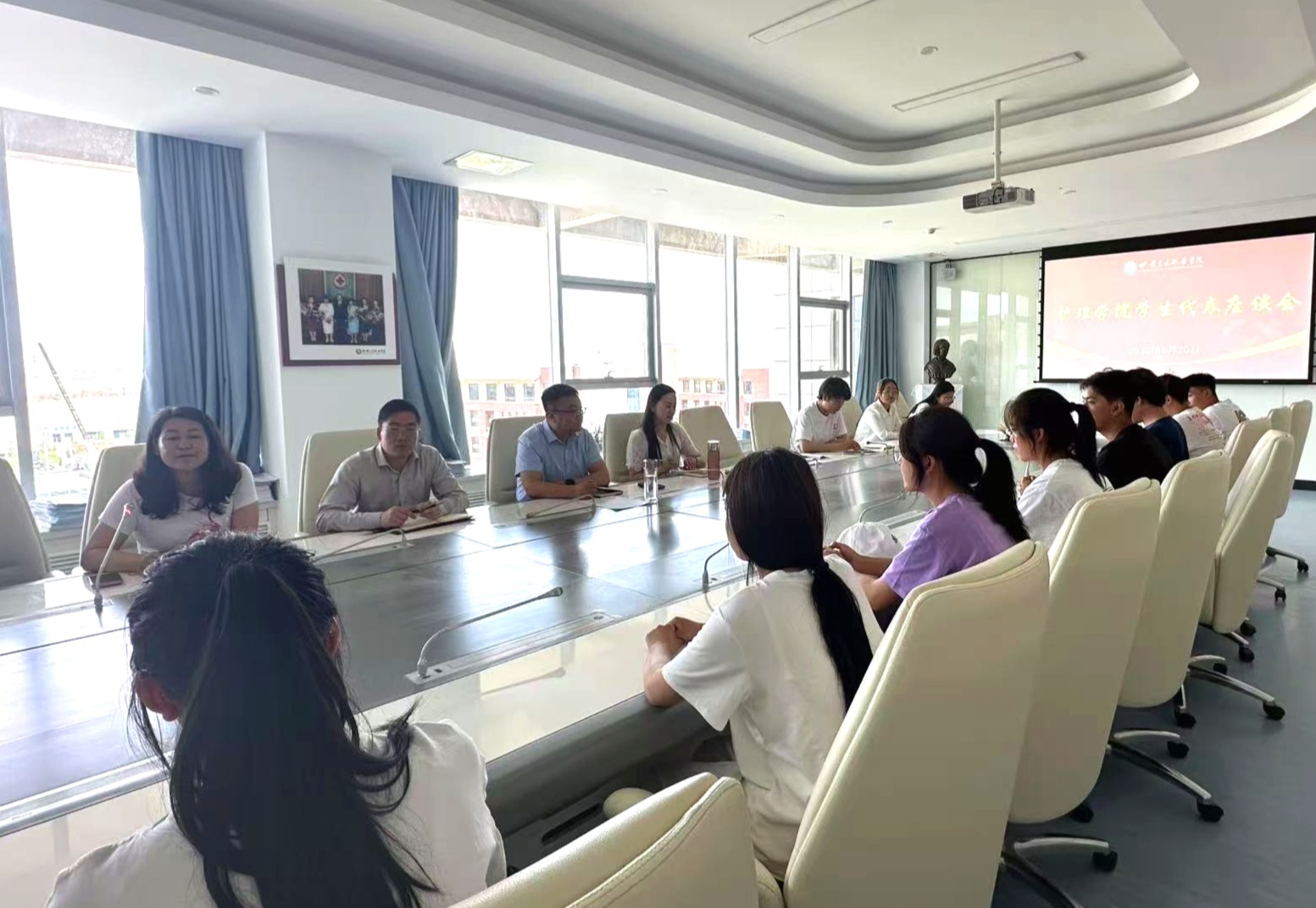 为铸牢中华民族共同体意识,深入了解学校少数民族学生的学习生活状况与思想动态,倾听学生心声,回应学生关切问题,进一步提升学生管理服务水平,5月20日中午,护理学院在南丁格尔会议室召开民族学生代表座谈会。学院班子成员出席会议,党建办公室、学生工作办公室、团委等部门老师及团学干部和各班民族学生代表参加会议。
