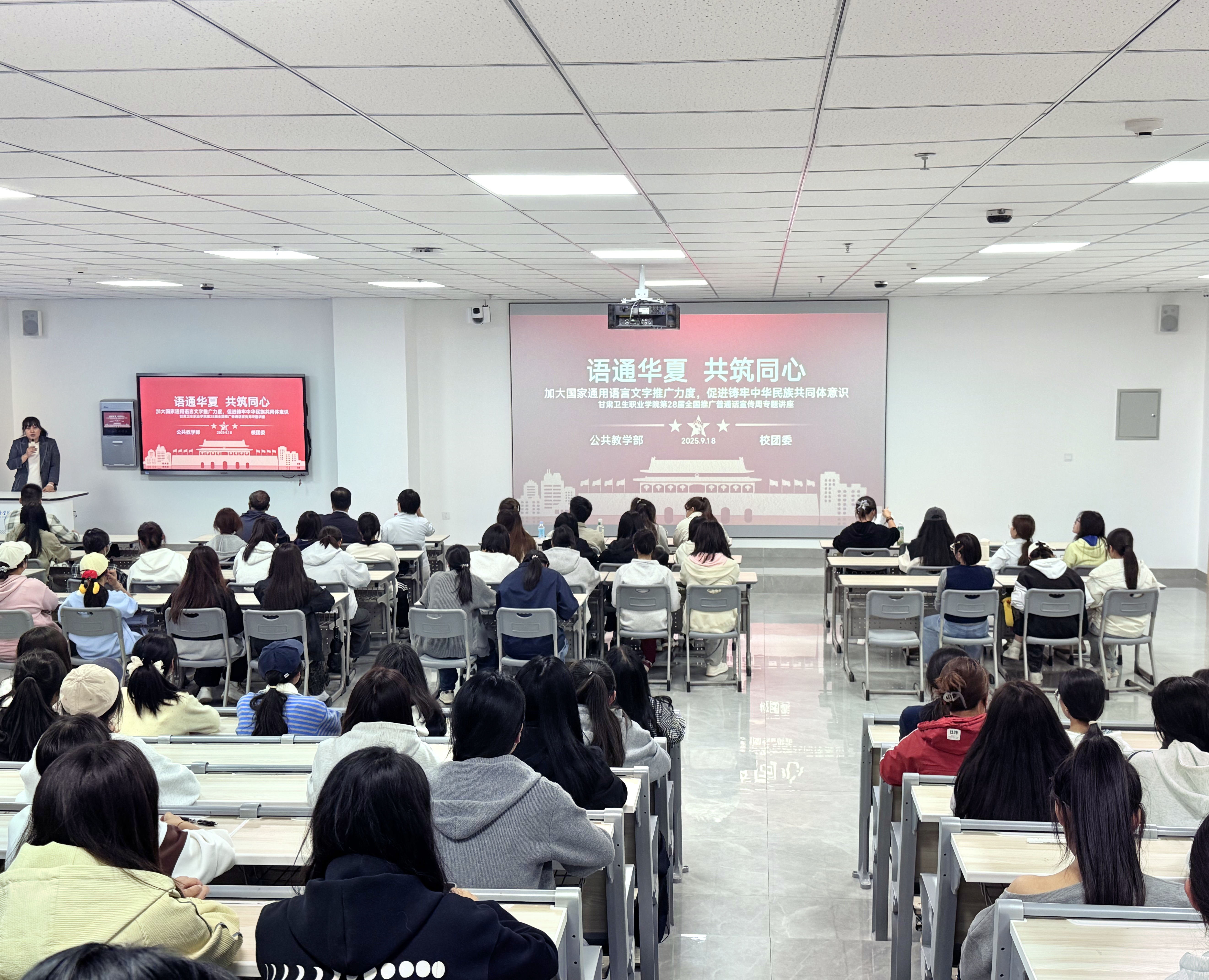 9月18日晚,公共教学部联合校团委举办“语通华夏·共筑同心”推普专题讲座。学校国家级普通话水平测试员周启平老师应邀主讲,公共教学部党总支书记、部长及全校在校班级学习委员参加活动。