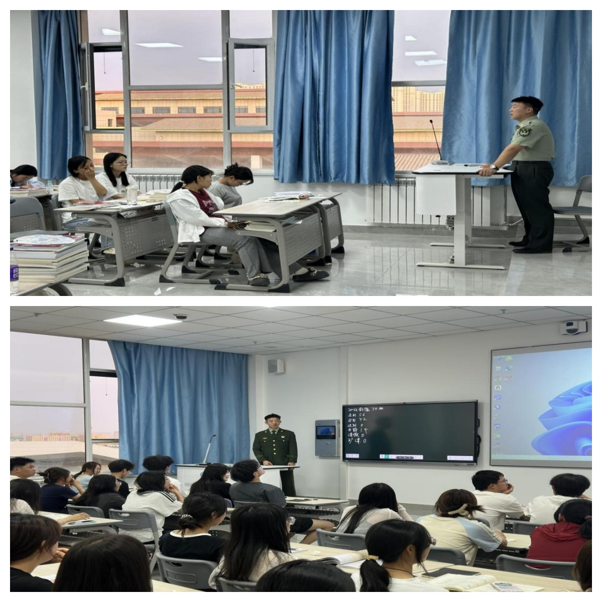 此外,“退役士兵进班级” 活动也开展得如火如荼。6月17日晚自习,医学技术与工程学院邀请学校国防教育协会的退役士兵走进各班级,为同学们分享部队生活点滴。他们讲述了训练日常中的酸甜苦辣、执行任务时的紧张刺激以及深厚的战友情谊,有的还展示了自己的荣誉勋章,讲述勋章背后的故事。还有退役士兵分享了退伍后凭借在部队培养的坚韧品质和良好习惯,在学业和生活中取得进步的经历。这些真实感人的故事,如同一颗颗火种,点燃了同学们投身国防、建功军营的决心。