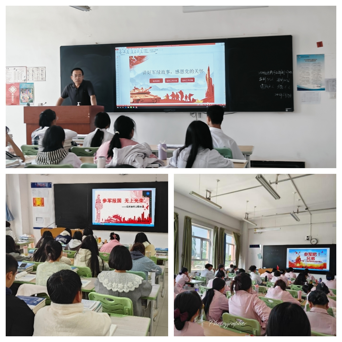 为进一步落实征兵工作要求,各二级学院也积极行动起来,在“征兵宣传月”期间开展了丰富多彩的征兵宣传活动。在征兵宣传主题班会上,辅导员们化身 “征兵宣传员”,通过播放精彩的军旅视频、详细讲解政策手册,向同学们介绍了应征入伍的条件、流程、时间节点及优惠政策。生动的画面和深入的解读,让同学们对参军入伍有了更清晰的认识,消除了心中的疑惑和顾虑。互动环节中,同学们踊跃提问,不少同学当场表示对参军产生了浓厚兴趣。
