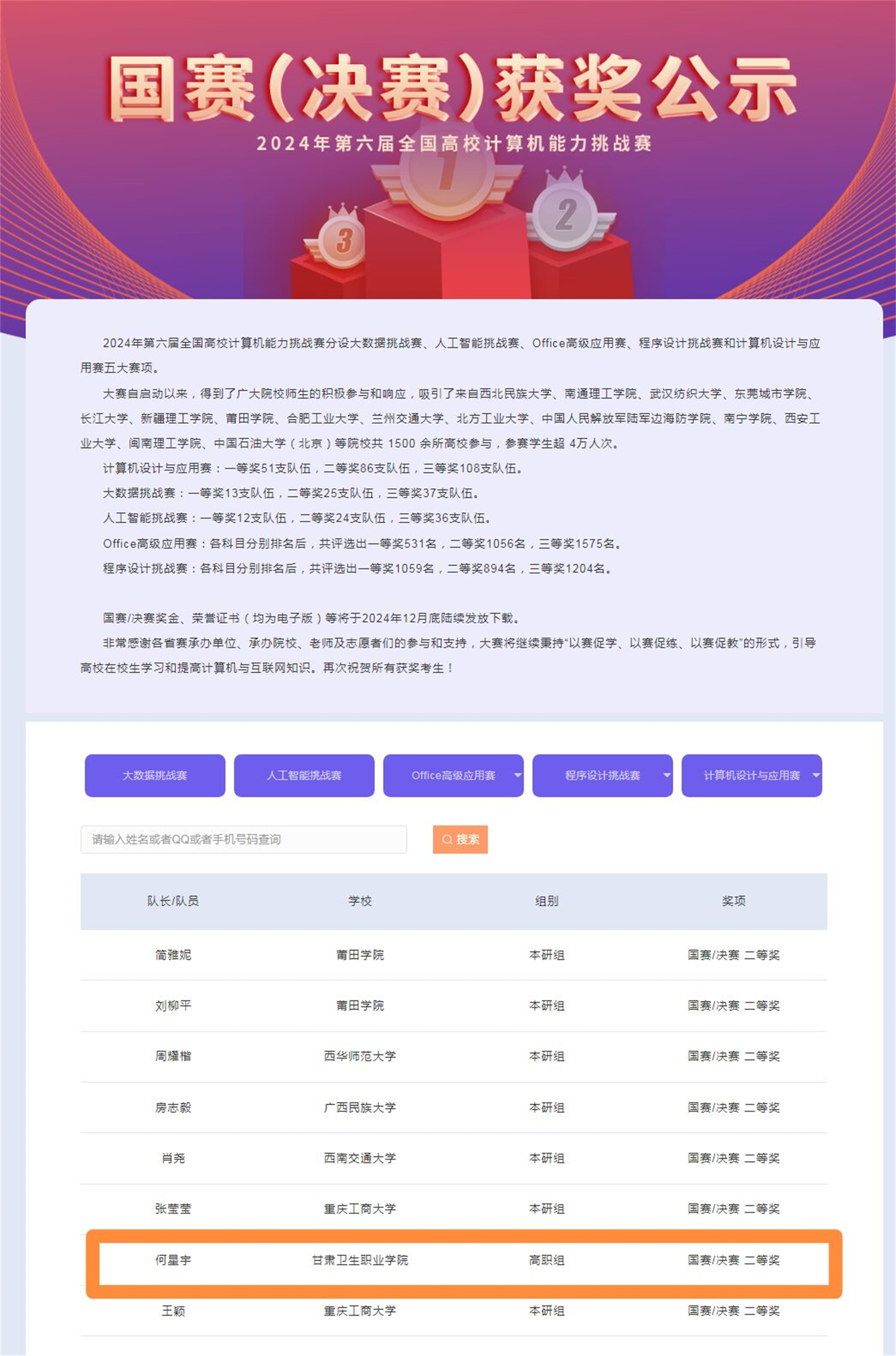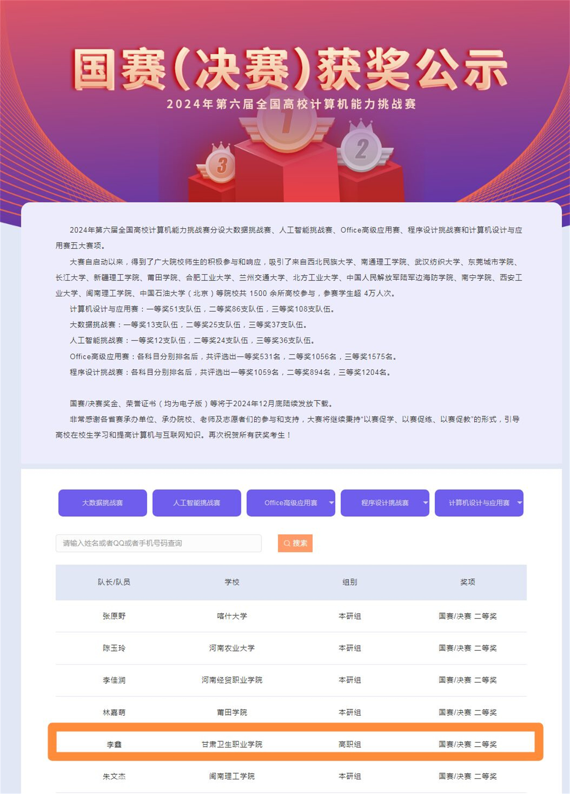 本次总决赛为前期各省赛、区域赛的一等奖选手们的再次比拼,共有来自北京化工大学、中国石油大学(北京)、中国人民解放军空军军医大学、合肥工业大学等900余所高校的学生参加。我校选手在备赛过程中,通过系统的培训和刻苦的练习,不断提升自己的计算机操作技能和团队协作能力。在比赛中,他们沉着冷静、灵活应变,充分展现了扎实的专业技能和良好的心理素质。这些荣誉不仅是对选手们个人努力的肯定,也充分展示了我校计算机应用课程的教学成果。