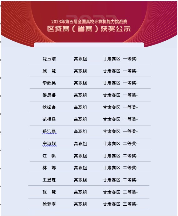 为贯彻落实习近平总书记关于“推动互联网、大数据、人工智能和实体经济深度融合”以及“善于运用互联网技术和信息化手段开展工作”的讲话精神,引导高校在校生学习掌握计算机与互联网知识,提高计算机应用能力、解决问题能力以及创新创业能力,为未来求职就业和生活学习打下坚实的技能基础,第五届全国高校计算机能力挑战赛甘肃赛区竞赛由兰州交通大学承办。学校接到比赛通知后高度重视,严格落实“第五届全国高校计算机能力挑战赛甘肃赛区竞赛暨甘肃省‘AI+’大学生创新创业大赛通知”要求,积极组织筹备,制定了完善的参赛培训方案,从近500名报名学生中选拔出20名优秀学生参赛。通过重点培养,精讲精练,在12月初的西北区域赛中,有13名选手脱颖而出,沈玉洁等7名同学获一等奖,林娜等5名同学获二等奖,徐梦涵获三等奖。其中,一、二等奖学生成功晋级国赛。经过为期一周的刻苦训练及最后的激烈角逐,林娜等2名同学获决赛一等奖,宁淑超等5名同学获决赛二等奖,沈玉洁等2名同学获决赛三等奖,卓晓华等5名老师获优秀指导教师。