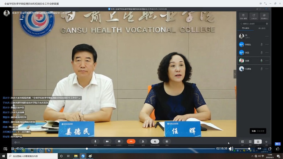 会议由省委教育工委委员、省教育厅党组成员、副厅长王光亚主持,省委教育工委书记、省教育厅党组书记、厅长王海燕出席会议并讲话,就秋季学期疫情防控和校园安全工作做了具体的部署,提出了明确的要求,同时结合下半年及今后一段时间的甘肃教育工作实际情况,对教育脱贫攻坚工作、两类学校建设工作、民生实事的实施工作、教师队伍建设、教育的项目建设工作、年度重点工作任务的完成、高质量发展年的推进工作、“技能甘肃”的推进落实、餐饮浪费治理工作、对下一阶段国家及省上出台重大的教育政策的研究贯彻与落实等十方面重点工作提出了要求。