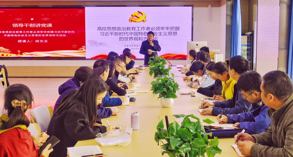 10月18日上午,在信息中心405平板教室,邱文云副校长以“高校思想政治教育工作者必须牢牢把握习近平新时代中国特色社会主义思想的世界观和方法论”为主题,为机关第四党支部、马克思主义学院教师党支部讲授了一堂严肃认真的主题教育专题党课。