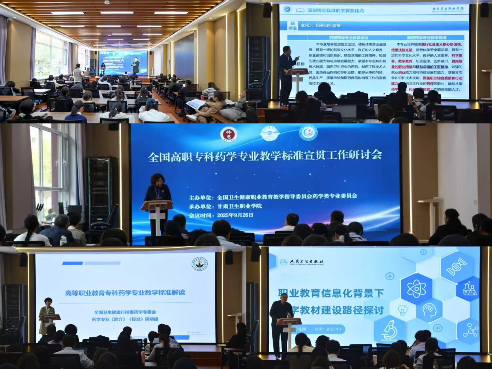 在经验交流环节,北京卫生职业学院副院长郝晶晶教授以“标准引领·匠心育人”为主题,分享了首都地区药学人才培养的实践经验;人民卫生电子音像出版社有限公司任刚董事长则围绕职业教育信息化,探讨了数字教材建设的路径与模式。