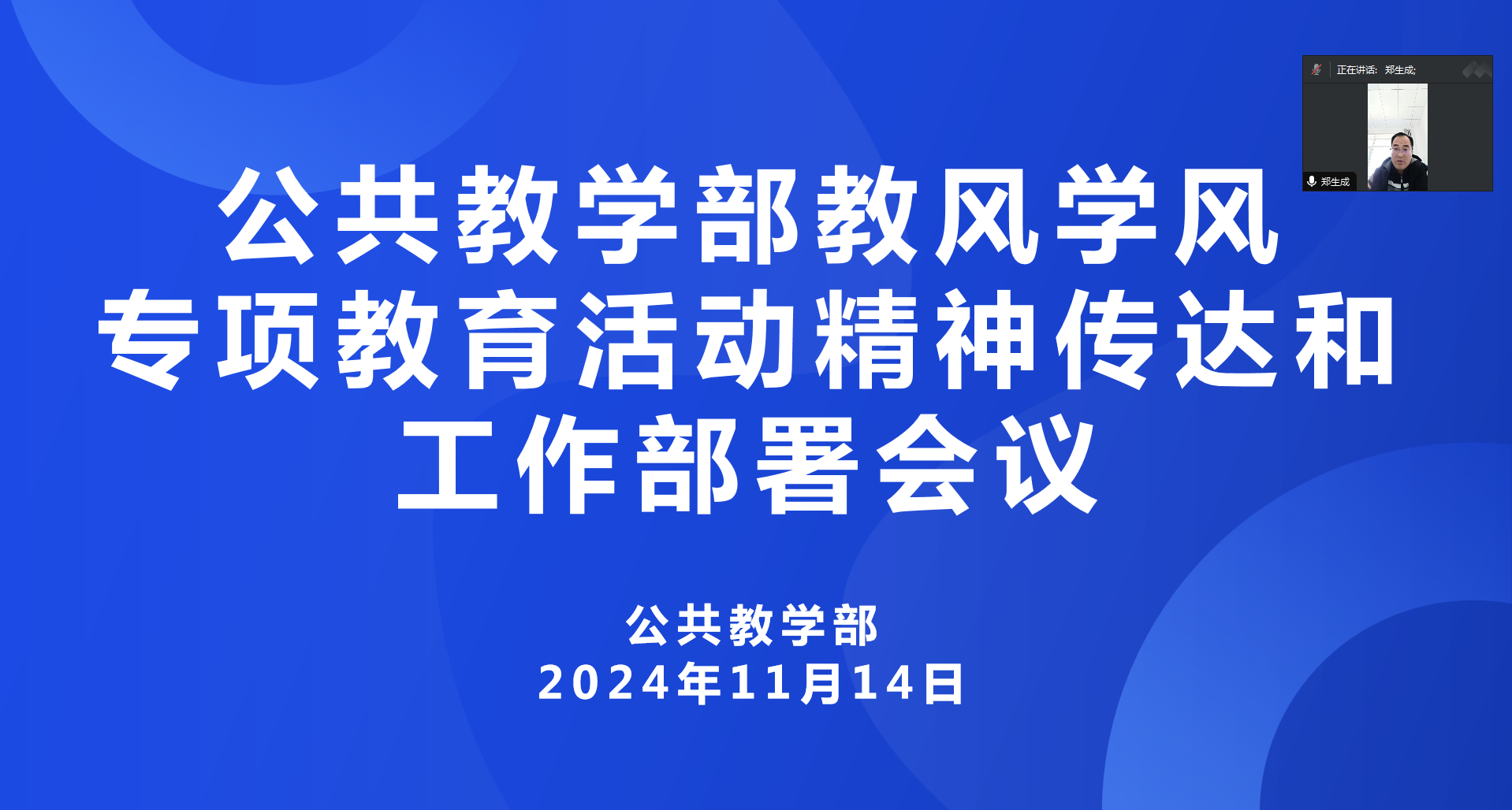 为深入贯彻落实学校教风学风专项教育活动动员大会精神,11月14日,公共教学部组织全体专兼职教师召开教风学风专项教育活动精神传达和工作部署会议,会议由党总支书记郑生成主持。