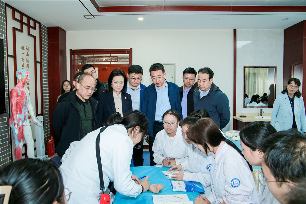 会后,与会人员参观了中医药学院实训中心,饶有兴致地旁听了正在进行的经络与腧穴等相关实训课程,对实训中心现代化、信息化的设备及极具人文气息的中医药文化氛围给予了肯定,共同探讨了中医药教学、实践等相关内容。