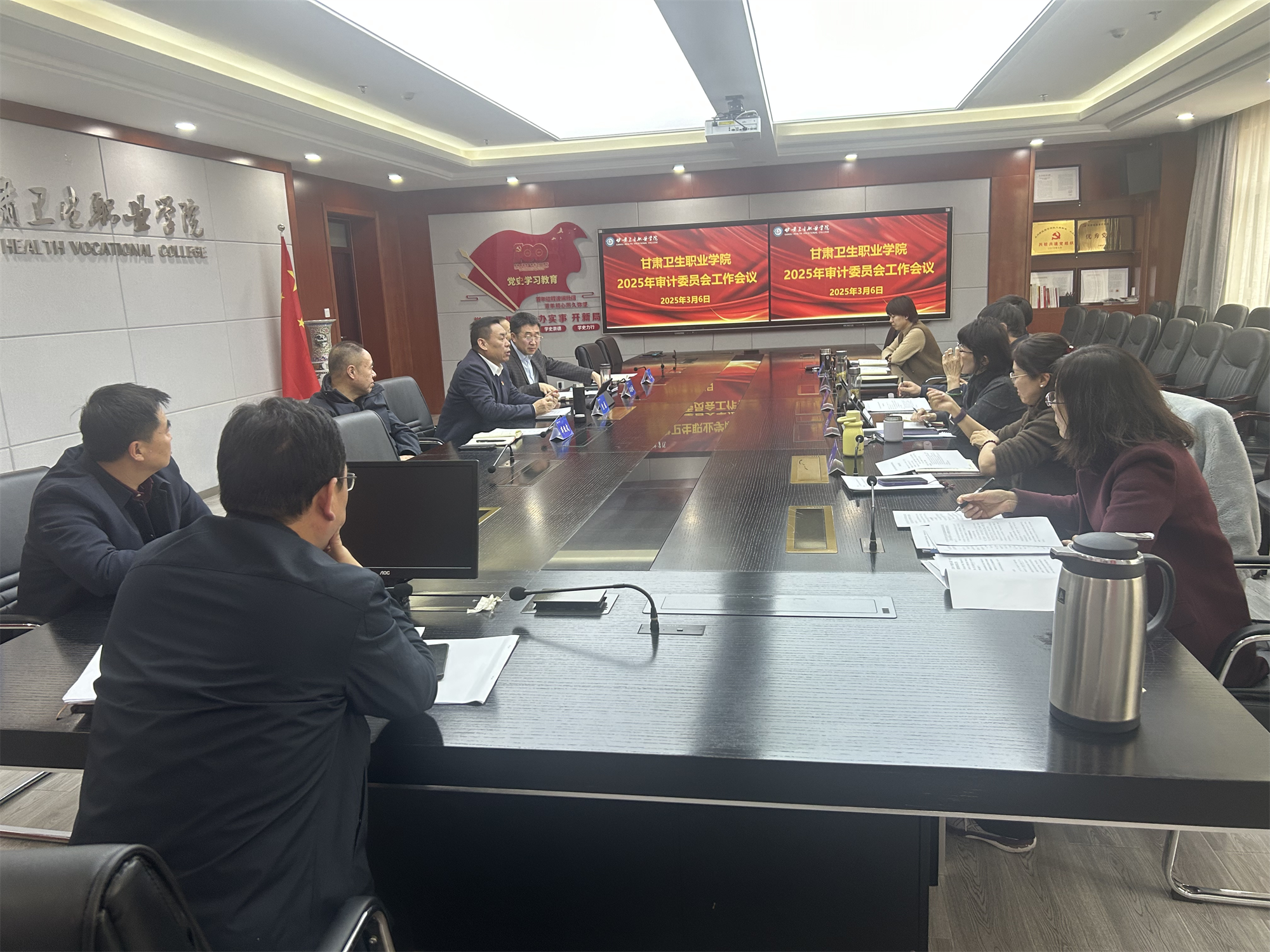会议首先由副校长高博带领全体与会人员学习了《审计署关于内部审计工作的规定》以及《中共甘肃省委审计委员会办公室甘肃省审计厅关于印发甘肃省推进内部审计工作高质量发展三年行动方案(2025-2027)的通知》。高校长强调,要以文件要求为指引,进一步规范审计流程、完善监督机制,为学校高质量发展提供坚实保障。