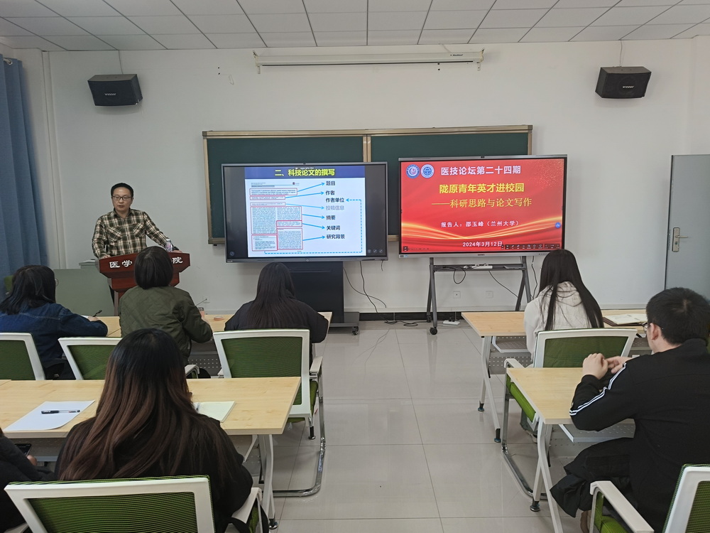 为进一步促进医学技术学院高质量发展,拓展学院教师科研视野,3月12日于学院会议室举办了医技论坛第二十四期“陇原青年英才进校园”活动,邀请兰州大学基础医学院博士生导师邵玉峰副教授做学术报告,报告题目为《科研思路与论文书写》。学院全体专兼职教师和辅导员参加。报告会由副院长张春雨主持。