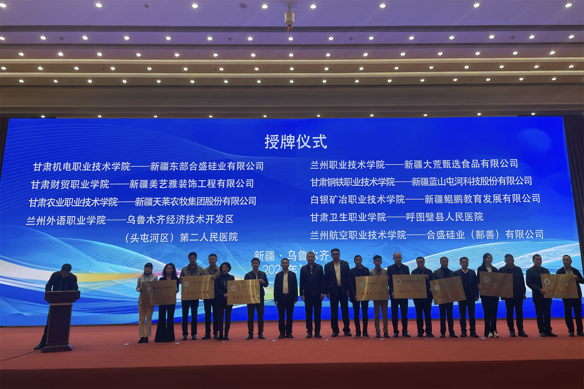 在座谈会上,新疆维吾尔自治区教育厅、新疆生产建设兵团教育局、甘肃省教育厅相关领导及企业、高校代表作了交流发言,省内的49所高校与企事业单位代表进行就业实习签约授牌仪式,我校为呼图壁县人民医院授牌。推介会现场,张军荣副校长一行与轮台县中医医院、若羌县人民医院、第六师五家渠市吾家乐宝养老总院、乌鲁木齐市金铖科技技工学校等用人单位深入交流,积极推介我校毕业生。