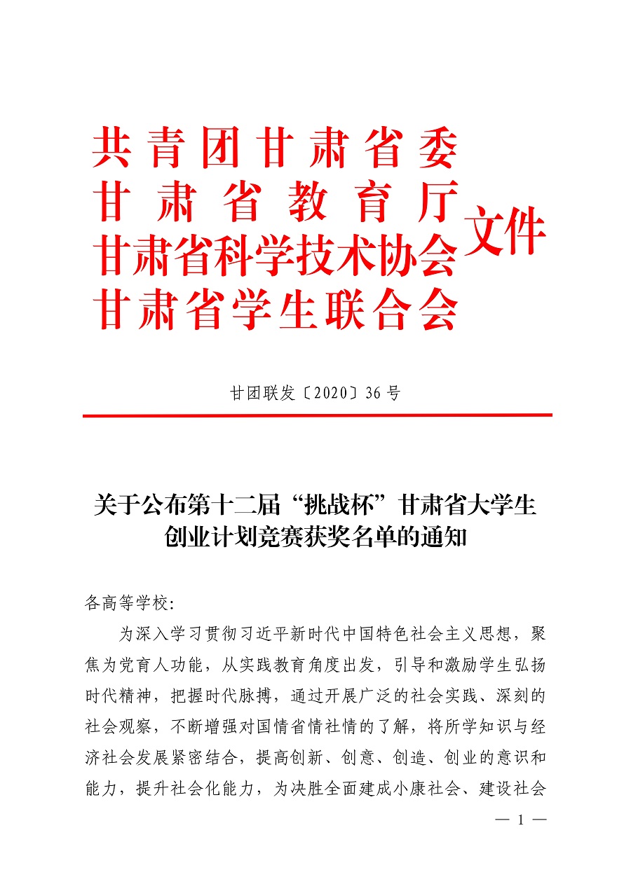 我校在第十二届“挑战杯”甘肃省大学生创业计划竞赛中获奖